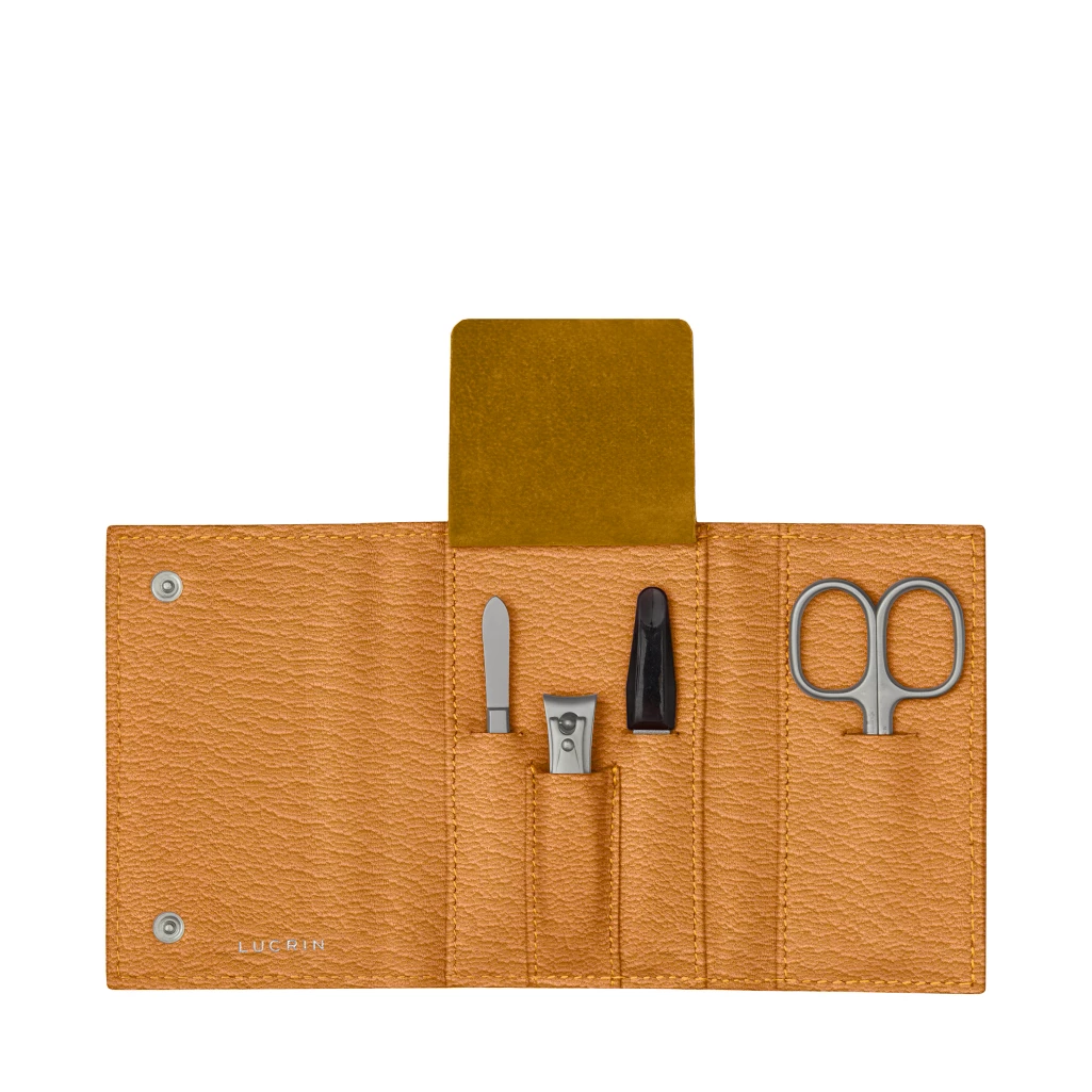 Case in full grain leather containing the manicure instruments. Made of mat hardened stainless steel. No nickel coating. Recommended for persons with allergies to nickel. - nail scissor of first quality - tweezer of first quality - nail clipper of first quality - nail file of first quality.